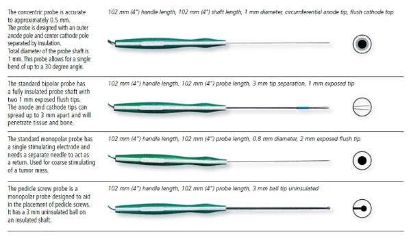 The standard monopolar probe has a single stimulating electrode and needs a separate needle to act as a return. Used for coarse stimulating of a tumor mass.