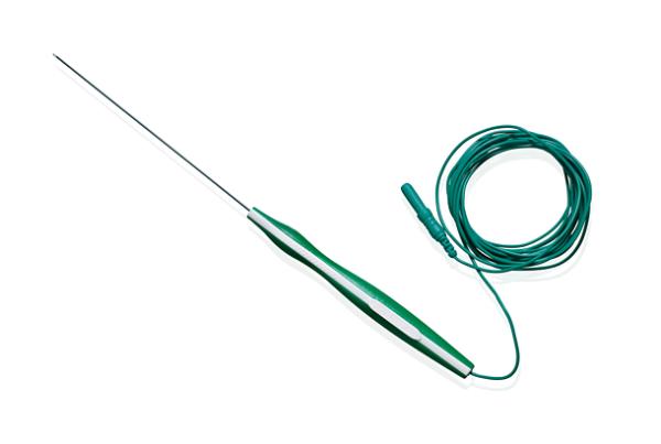 The standard monopolar probe has a single stimulating electrode and needs a separate needle to act as a return. Used for coarse stimulating of a tumour mass.