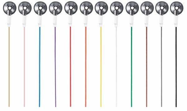 The Ambu Neuroline cup electrode is available in a variety of patient ready packaging configurations; 10, 15, 23, 25 and 27 unit pouches. The packaging options allow for the choice of only one pack per clinical application. The color coded, pre-attached lead wires facilitate easy identification of each cup electrode.